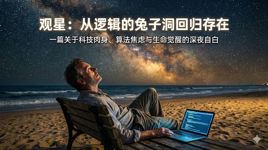 随笔 观星——从逻辑的兔子洞,回归存在的当下 2026年1月13日 - By Hardi Huang 日期: 2026年1月12日 地点: 归家途中的海边公园 天气: 夜空澄澈 这两天感觉自己活在一个深不见底的“兔子洞”里。 筹备接下来截止日期很近的营队,每天睁眼闭眼全是功能,和AI协作的不亦乐乎,一…
